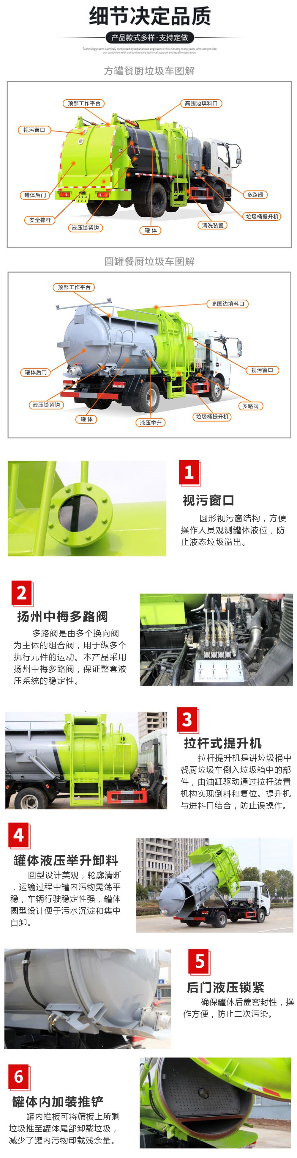 罐体采用优质碳钢板材,罐体内部带固液分离功能(全推推板,不锈钢泔水分离网板),罐内加热功能(用于严寒地带防止罐内餐饮垃圾冻结凝固,采用柴油燃烧机加热,加热速度快效果好,可设置高低温实现自动温控)全液压操作系统,工作人员操作方便,罐体举升自卸,拉杆式挂桶提升机,可以挂120/240升垃圾桶进行作业,后盖液压驱动开启、锁紧,方便人员操作。